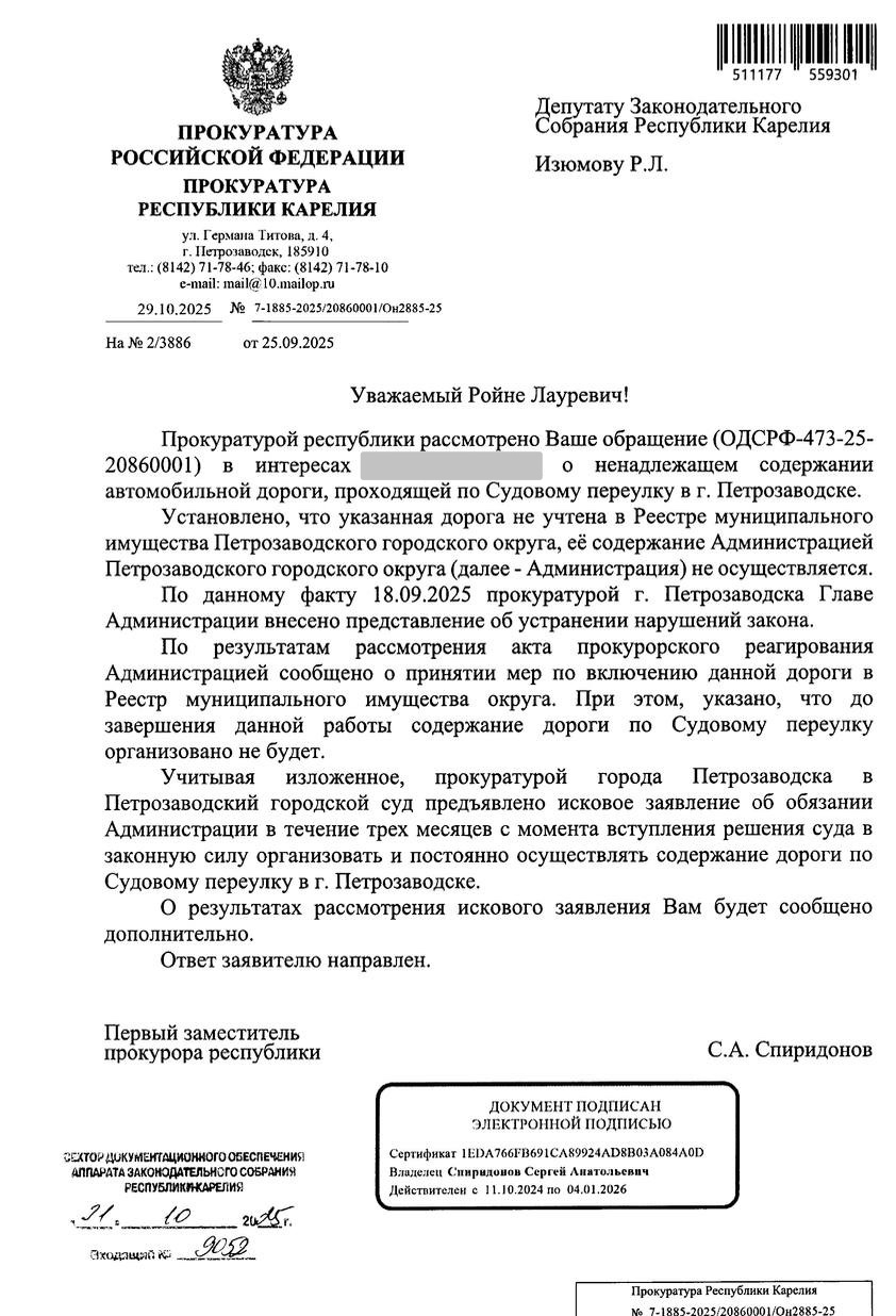 В результате прокуратура выявила нарушения, внесла представление в администрацию Петрозаводска и обратилась в суд с требованием обязать муниципальные власти включить Судовой переулок в реестр муниципального имущества и обеспечить его регулярное содержание.